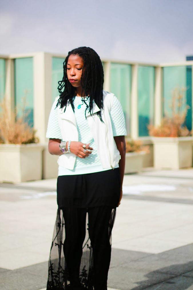 I've pretty much convinced myself that Spring is here already regardless of what the actually reality is here in New York. However, because I don't want to freeze to death, I'm wearing more Spring colours on a lot of my upcoming blog posts which is a pretty big change since "all black" has been my theme colour pretty much the whole Winter season. For this look, I'm wearing very light pastels on top that fades into this beautiful black mesh skirt. I've really been loving light blue more and more...I find it to be such a pure and happy colour. The faux leather vest I'm wearing was actually a piece I snatched from my mother's closet when I went back to Jamaica during the Christmas holidays...I love it so much, especially because of its unexpected silk chiffon detailing in the back. I kept it pretty "simple" when it came to accessorizing with jewelry...the light/delicate touch of the stone necklace was just enough to make this look a perfect transitional look from Fall to Spring.